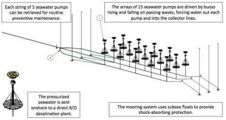 As waves pass under the array (as seen here to the right), the buoys rise. A series of free-floating platforms called Variable Sea Anchors or “VSAs” are connected beneath the pump and provide drag to the rising buoys. The pumps located between the VSA and buoy are designed to take advantage of the resulting tension to pull in sea water and pump it towards shore. The entire array acts in series with five pumps along three separate strings to increase the volume and pressure of water being delivered on shore through a central pipe. The seawater is then run through an R/O system that takes advantage of the arriving pressure to desalinate the seawater with no external energy input. Pressurized seawater can also be directed to land based aquaculture. As Atmocean reaches economy of scale and realizes additional efficiency, future arrays could be used for power production with pressurized water going through a simple Pelton water wheel to generate renewable electricity.